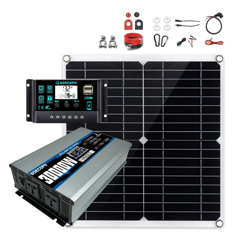 SOECOPO 30000W Portable Solar System Kit 800W Panel Dual voltage input Inverter 2 sockets 12V/24V 100A Controller Camping/Home